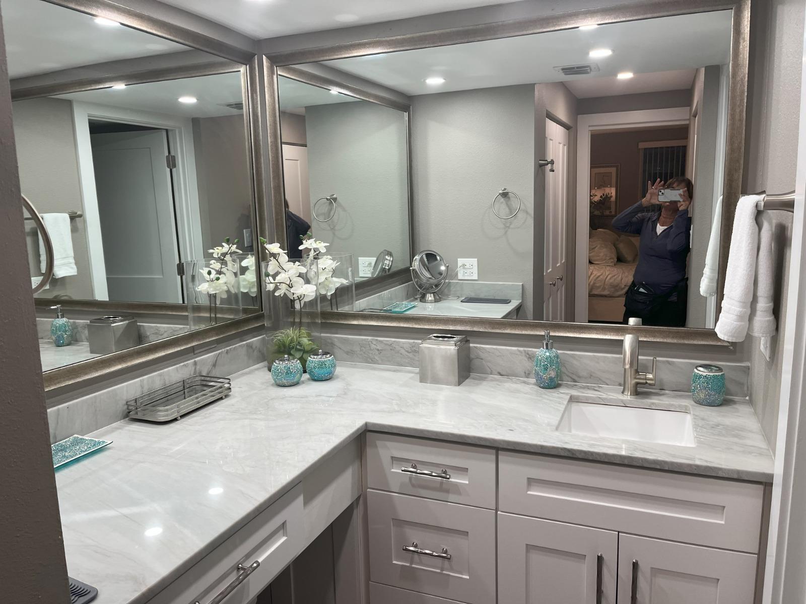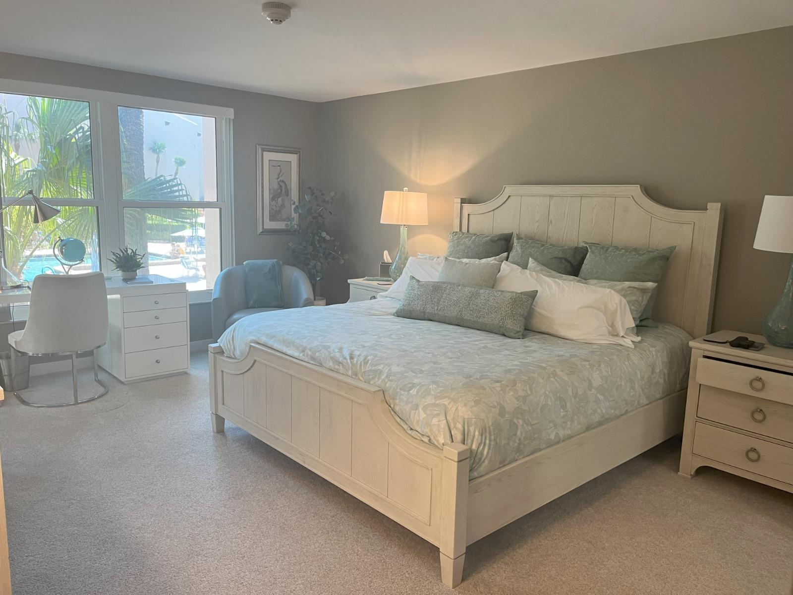 Primary bedroom with windows overlooking pool/gulf and direct lanai access